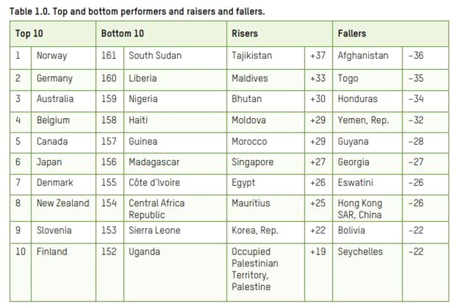 The top ten in the labor sector are high-income European countries, including Slovakia. They boast strong labor policies, low levels of unemployment, and low levels of wage inequality. The three nations with biggest improvements in the labor sector are Moldova with improved women's rights and reduced vulnerable employment; Palestine, which increased the minimum wage significantly; and Egypt, where the minimum wage was extended to the private sector.