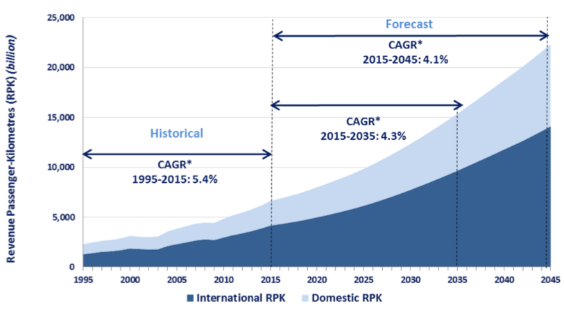 passenger-kilometers (RPK) will triple by 2045, compared to today.
