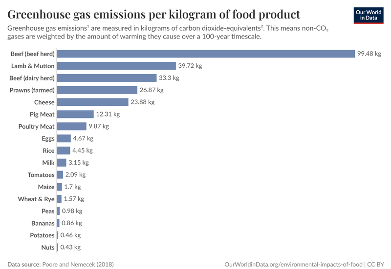 (Source: ©Our World in Data. Greenhouse Gas Emissions per Kilogram of Food Product, https://ourworldindata.org/grapher/ghg-per-kg-poore)