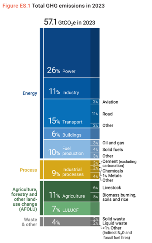 A staggering 57.1 Gt CO₂e. Let’s see which sectors contribute most: