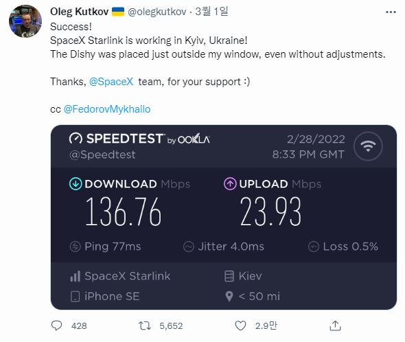 Oleg Kutkov, who had purchased a Starlink satellite dish from an internet shopping mall a few months earlier and had been keeping it stowed away, connected his satellite dish outside the window as soon as he learned the news that Starlink would start service in his country, the Ukraine.It is no exaggeration to state that it is