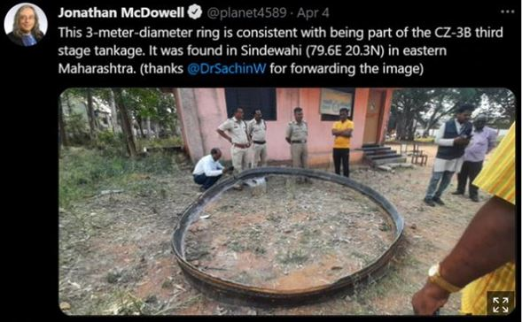 Tweet announcing that Chinese space debris fell on Indian village.