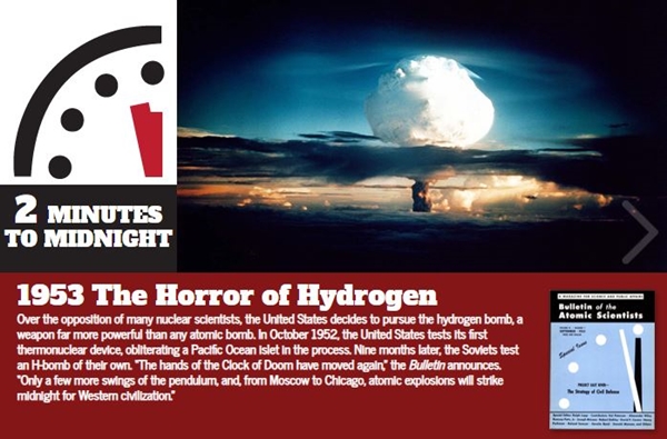 When the United States tested the first hydrogen bomb, the clock moved forward to 11:58 p.m., signaling to mankind that the end of the world was just two minutes away.