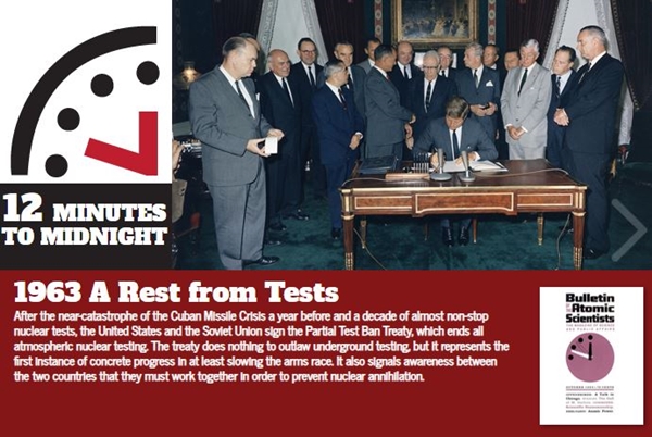 When United States and Soviet Union signed the Partial Test Ban Treaty in 1963, ending nuclear explosion tests in the atmosphere, the clock's minute hand moved backward to 23:48.
