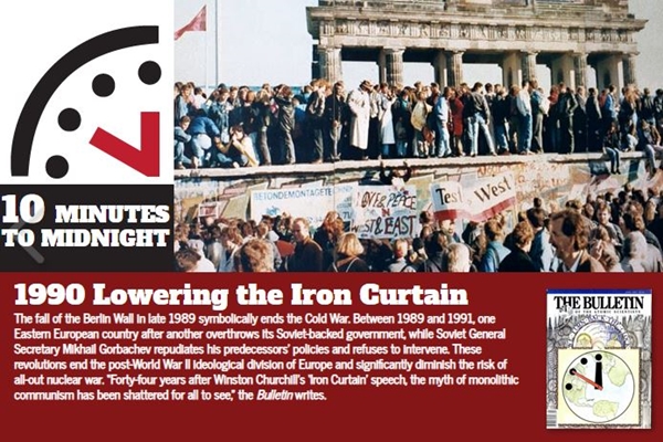 The time to global holocaust is pushed back to 23:50 as the Berlin Wall falls.