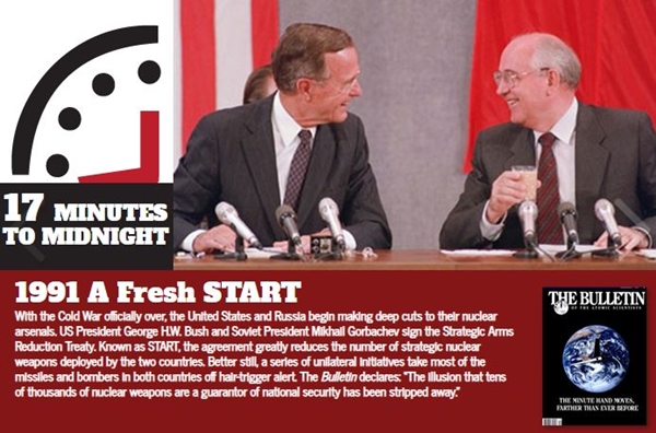 With the end of the Cold War and signing the Strategic Arms Reduction Treaty between the USA and USSR, the Doomsday Clock receded 17 minutes to 23:43, removing humanity from the originally denoted midnight warning range of 15 minutes. According to the Doomsday Clock, it was the most hopeful year for peace ever.