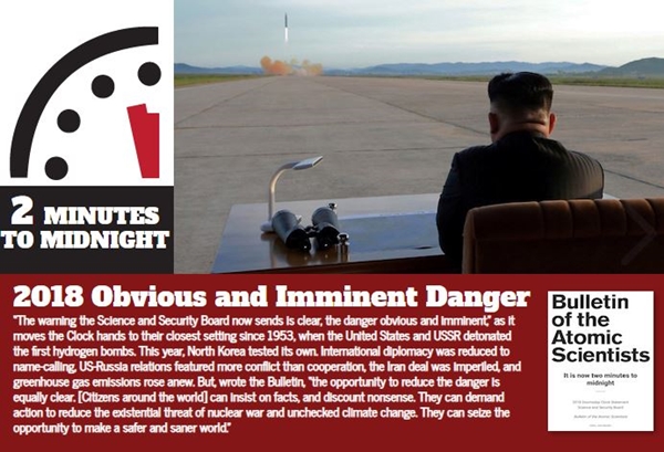 North Korea's nuclear tests and climate change crisis pushed the clock forward to 23:58, with two minutes left, the closest to midnight since the U.S. and Soviet hydrogen bomb tests in 1953.