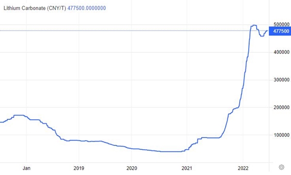 (Lithium price trend over the past 5 years. Source: Trading Economy)