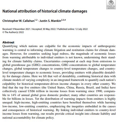 Christopher Callahan, first author of the Dartmouth research paper mentioned above, said, "This study provides a scientific basis for the claim of climate responsibility."