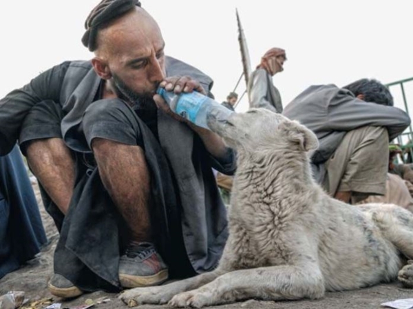 (Afghan man addicted to drugs exhales drugs into his dog's mouth. Source: AP)