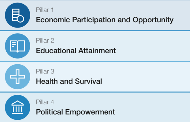 opportunities of men versus women in each country four key areas. ▲Economic Participation and Opportunity ▲Educational Attainment ▲Health and Survival and ▲Political Empowerment.