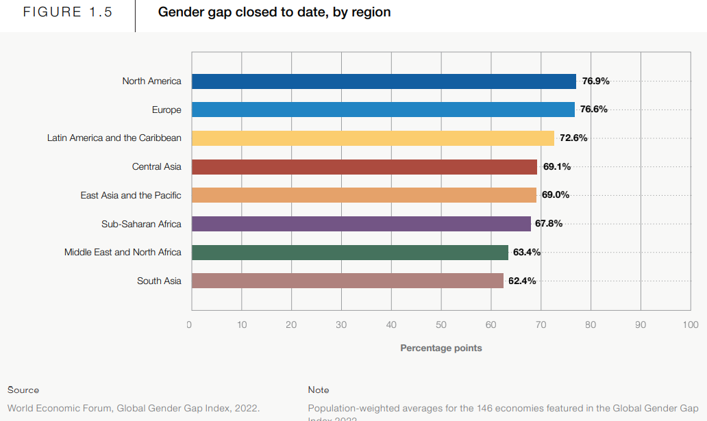 According to the 2022 Gender Gap Index, North America (76.9%),