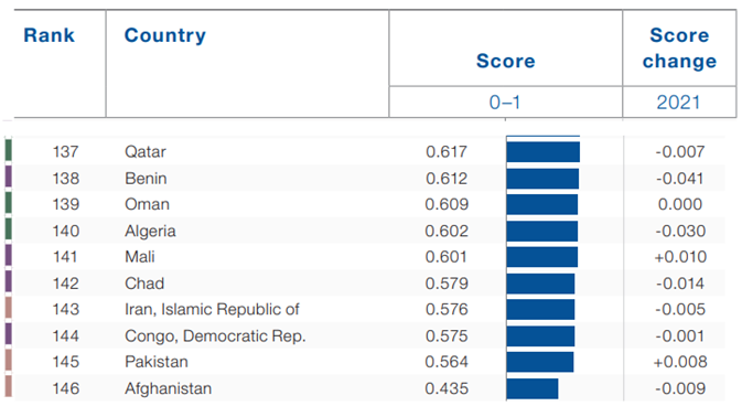 In 2022, Afghanistan (0.435) topped the list with the largest