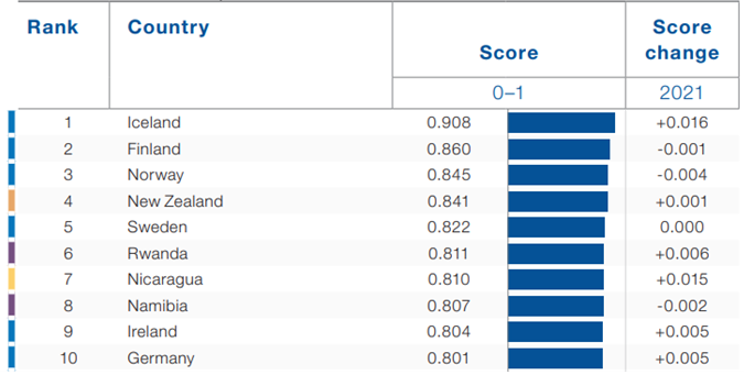 According to the 2022 Gender Gap Index, Iceland (0.908) topped the