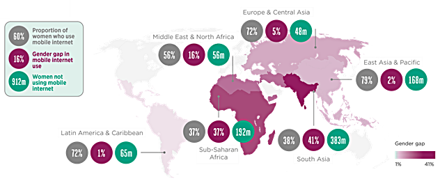 to own a mobile phone than men, and 16% less likely to use mobile Internet.