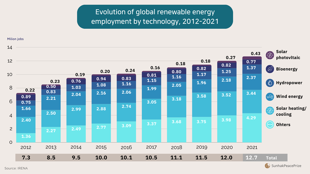 Evolution of global renewable energy employment by technology, 2012-2021 (Source: IRENA)
