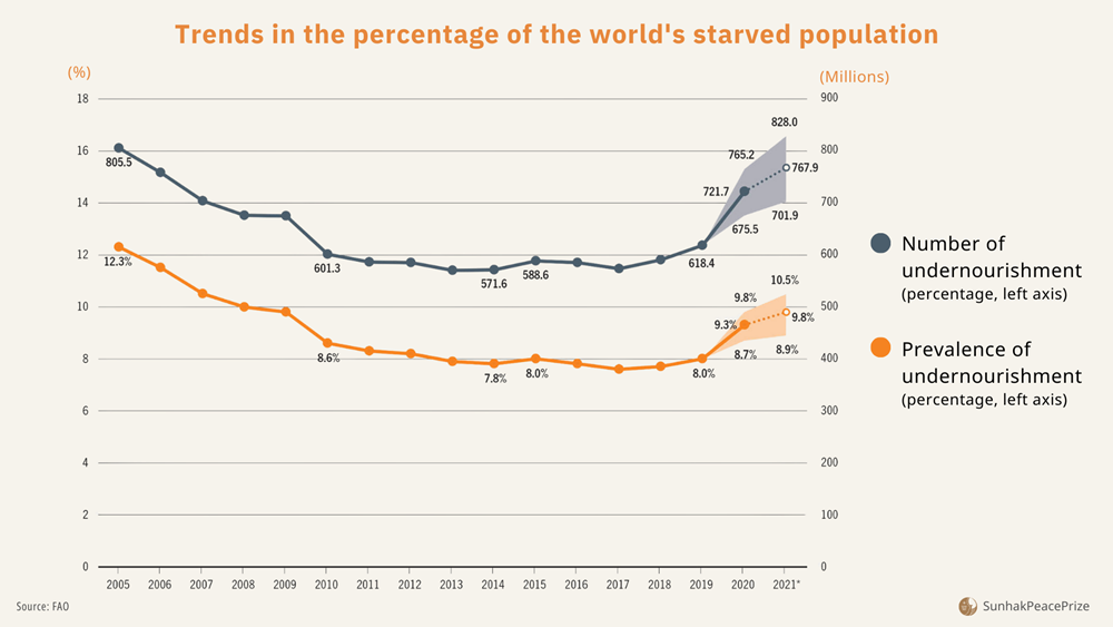 According to the The State of Food Security and Nutrition in the World 2022 published by the FAO, UNICEF, WFP, and WHO, an estimated 768 million people (at least 720 million people and at most 828 million people) worldwide faced hunger in 2021, comprising 9.8% of the world’s population.