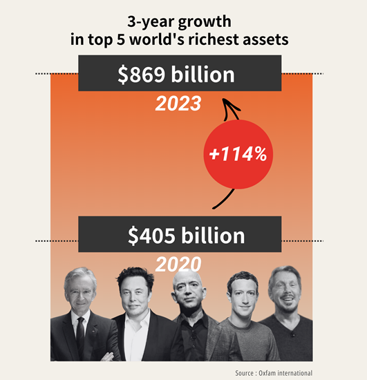 According to the Oxfam report 'Survival of the Richest' published in January 2023, the income of the world's top 1% wealthiest people mainly comes from asset earnings, which are typically taxed at a lower rate compared to labor income, exacerbating the rich-get-richer phenomenon. The report argues that Wealth Tax can play an important role in economic development and expanding access to public services.