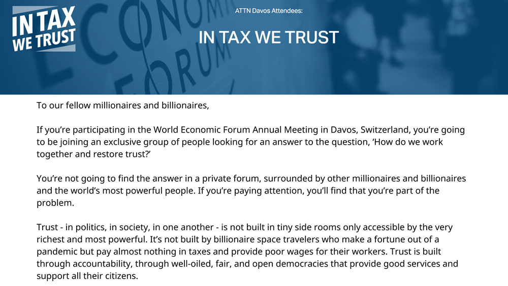 In January 2022, members of the progressive wealthy group 'Patriotic Millionaires' suggested improving the unfair tax system through an open letter titled 'In Tax We Trust.'