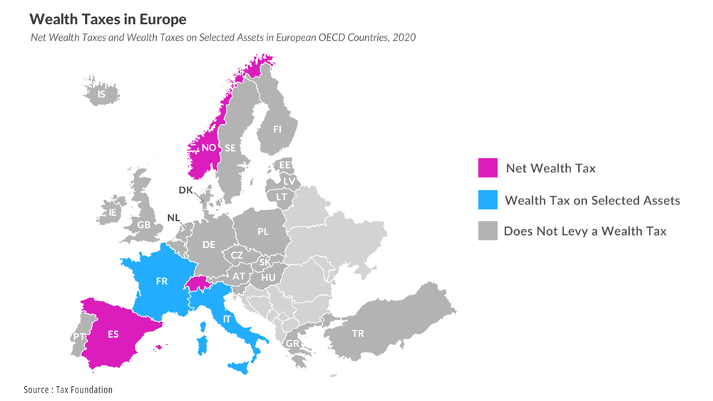 According to a report by the Tax Foundation, as of 2020, among the OECD countries, Colombia, France, Norway, Spain, and Switzerland impose various forms of Wealth Tax on individuals' net assets. In these countries, the revenue from the Wealth Tax accounted for about 1.5% of the total tax revenue, with Switzerland notably reaching 5.12%.