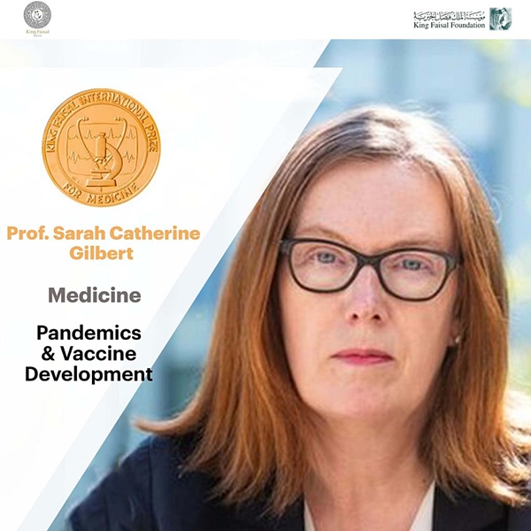 옥스포드-아스트라제네카 코로나19 백신을 접종한 여성인 사라 길버트 옥스퍼드 대학교 너필드 의학과의 백신학 학과장이 파이살 왕 의학상 수상자로 선정됐습니다. 그녀는 효율성, 저렴한 비용 및 접근성으로 인해 수십억 명의 생명을 구하는 180개 이상의 국가에서 사용되고 있는 백신을 공동 개발했습니다.
