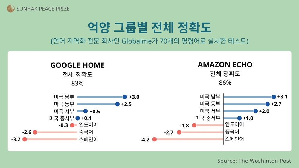구글 홈(Google Home)과 아마존 에코(Amazon Echo)는 미국식·영국식 억양에는 높은 인식률을 보였지만,