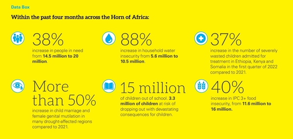 유니세프가 밝힌 데이터를 보면 2021년에 비해 2022년 1분기에 이 지역 중증 허약 아동의 수가 37% 증가했으며, 2021년과 비교해 많은 가뭄 피해 지역에서 조혼 및 여성할례가 50%이상 증가했다고 합니다.
