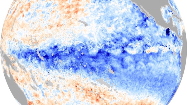 (2020-21년 동안 발생한 라니냐로 내려간 태평양의 수온, 출처 NASA)