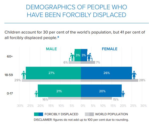전체 난민 중 어린이가 차지하는 비중은 41%로, 세계 인구 중 어린이의 비율인 30%를 훌쩍 넘고 있습니다.