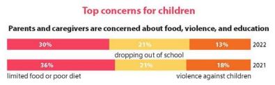 11개 지역 467가구의 난민 2,522명을 대상으로 한 조사에서 아동 난민과 관련해 가장 우려되는 점으로 ▪식량/ 영양부족 ▪학업중단 ▪아동폭력을 꼽았습니다.