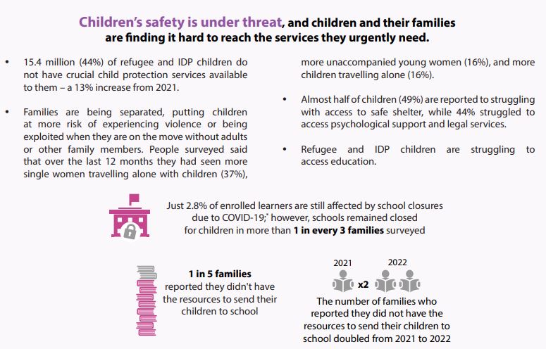 어린이 난민은 약자 중의 약자로 안전과 보호를 절실히 필요로 합니다. 국경 지역에 도착한 어린이 난민들은 이산가족, 폭력, 성 착취, 인신매매 등 범죄에 노출돼 있습니다.