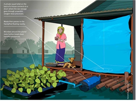 먼저 생활하수나 배설물을 혐기성 미생물이 활동하는 드럼통 안으로 보내 처리합니다. 이를 다시 인공 습지로 보내 부레옥잠 같은 식물, 다양한 미생물을 통해 분해, 흡수하도록 설계한 장치입니다. 이를 집집마다 설치하여 사용한다면 호수의 수질오염 문제를 획기적으로 해결할 것으로 주목받고 있습니다.