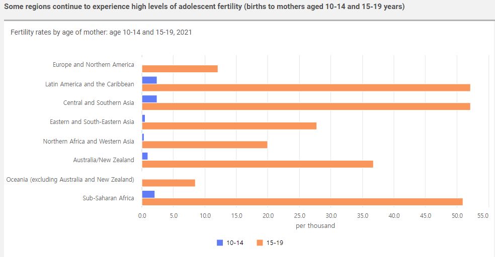 사하라 이남 아프리카와 라틴아메리카 지역은 최근 감소했지만 여전히 높은 수준의 10대 출산율을 보이고 있습니다. 202115~19세 여성의 1,000명 당 출생아 수는 사하라 이남 아프리카에서 101명으로 가장 높았고, 라틴아메리카와 카리브 해 지역에서 53명을 보였습니다. 10~14세 여성의 출산 통계도 같은 순위가 나왔습니다.