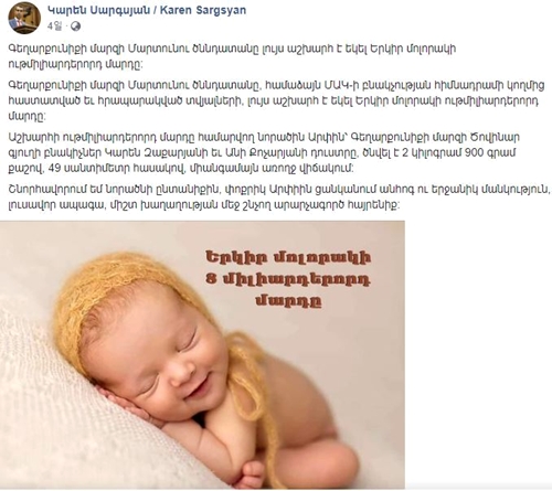 202211월 15일 서아시아의 아르메니아에서 키 49cm, 몸무게 2.9kg의 여자아이가 태어났습니다. 이 아이의 이름은 아르피(Arpi)입니다. 유엔은 이 아이의 탄생을 축하했고 아이가 태어난 게가르쿠니크(Gegharkunik)주의 주지사도 소셜미디어에 아이의 탄생을 알렸습니다. 세계 언론들도 아르피의 탄생을 보도했습니다.