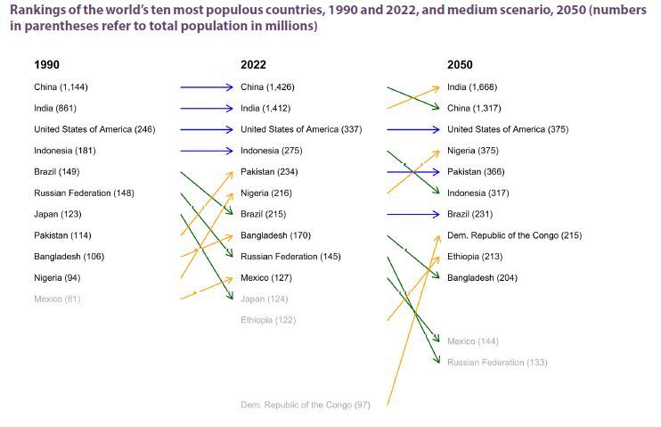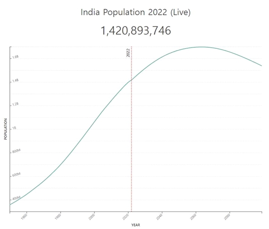 내년인 2023년도에 인도가 중국을 추월해 세계 인구 1위국 지위에 올라설 예정입니다. 두 나라 인구는 현재 약 14억 명으로 비슷하지만 2050년엔 인도가 166천만 명, 중국은 131천만 명이 될 것으로 보입니다.