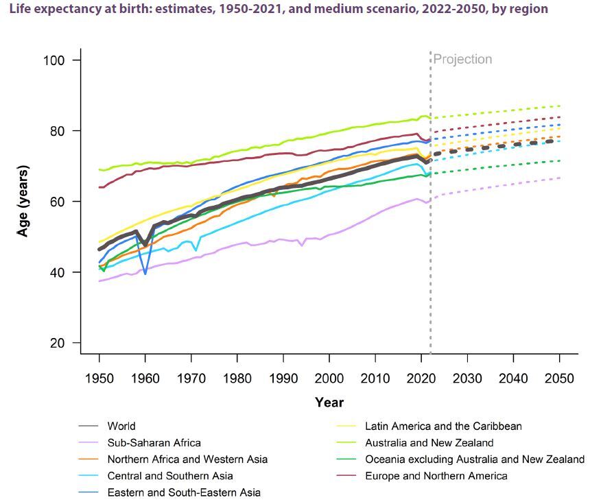 2019년 기준 전 세계의 기대 수명은 72.8세인데 2050년에는 77.2세로 늘어날 전망입니다. 하지만 현재 저소득 국가의 기대수명은 63세로 세계 평균보다 거의 10년이 낮습니다. 이 격차는 2050년에 8.4년으로 줄어들 것으로 예상됩니다.