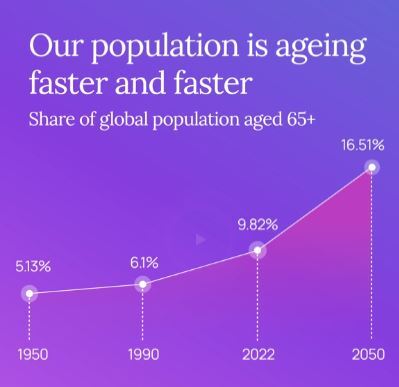 전 세계적으로 65세 이상의 인구가 빠르게 증가하고 있는데 65세 인구 비율은 202210%에서 205016%로 증가할 것으로 예상됩니다. 때문에 인구 고령화 국가들은 장기요양시스템 및 사회보장, 연금시스템의 지속가능성을 개선하는 등의 노력이 필요합니다.