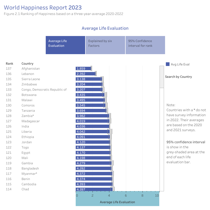 전 세계에서 행복도 점수가 가장 낮은 나라는 아프가니스탄(1.859점)과 레바논(2.392)였습니다. 이들 국가의 기대수명은 가장 행복한 10개국보다 5점 이상 낮았습니다(0-10점 척도).