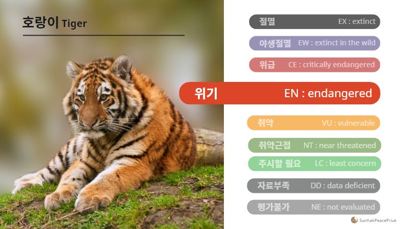 호랑이는 현재 세계자연보전연맹(IUCN) 적색목록에 ‘위기(EN, Endangered)’ 종으로 등재된 심각한 멸종위기종입니다.