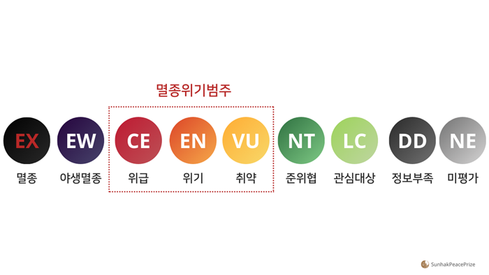 ㆍ위기(EN : endangered) : 분류군이 야생에서 가까운 미래에 매우 높은 멸종위기에 처하게 됨