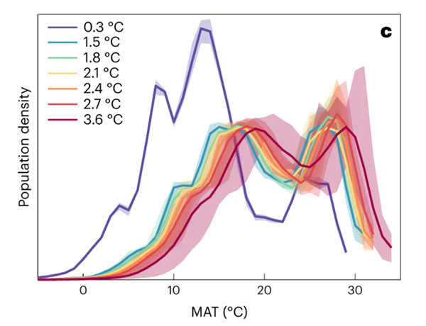 기후 평균온도 상승폭에 따른 기후 적소 바깥에 사는 인구수 분포