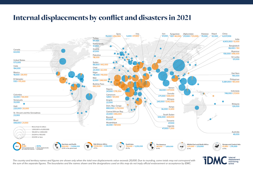 2022년 자연재해와 전쟁으로 발생한 난민 규모. 파란색은 기후난민을, 주황색은 전쟁난민 규모를 나타낸다.