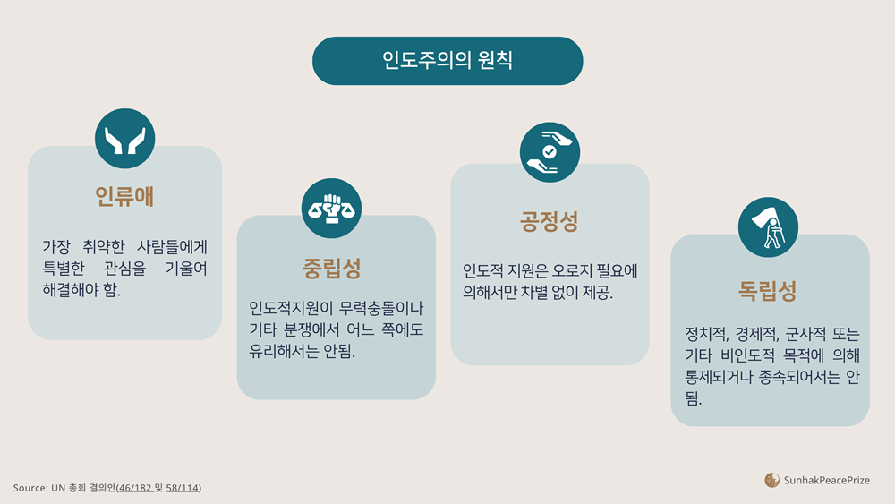 때문에 유엔에서는 인도주의의 원칙을 제시하고 있는데요, 바로 인류애, 중립성, 공정성, 독립성입니다. 인도주의 원칙은 2개의 UN 총회 결의안(46/182 및 58/114)에 의해 승인되었습니다.