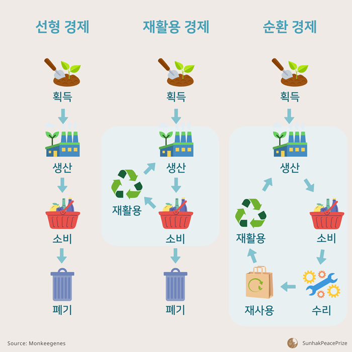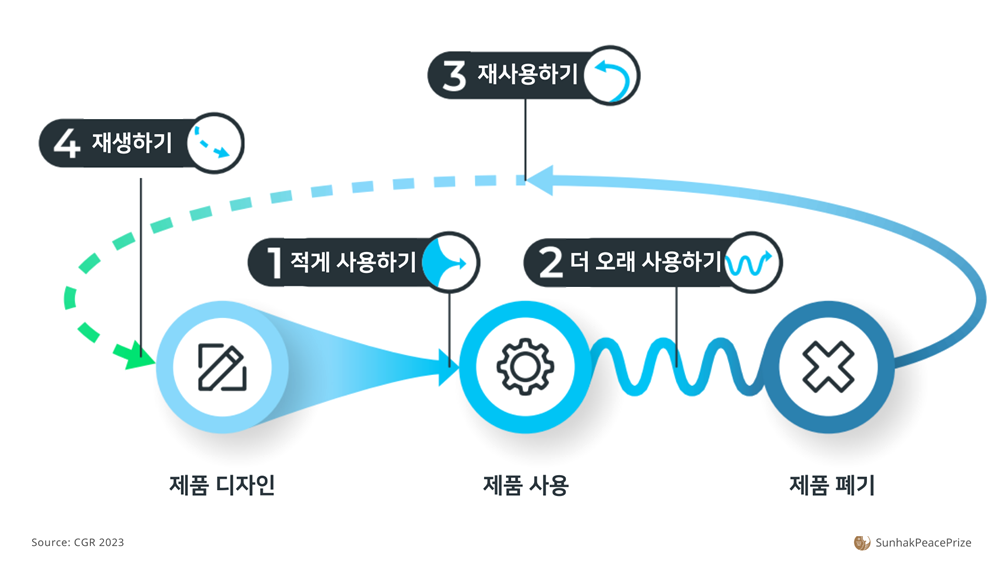 순환경제(Circular Economy)란 제품 설계 단계에서부터 자원의 재사용·재활용을 전제로 하여 쓰레기 배출을 최소화하고 자원의 지속 가능한 사용을 촉진하는 산업 모델을 의미합니다.