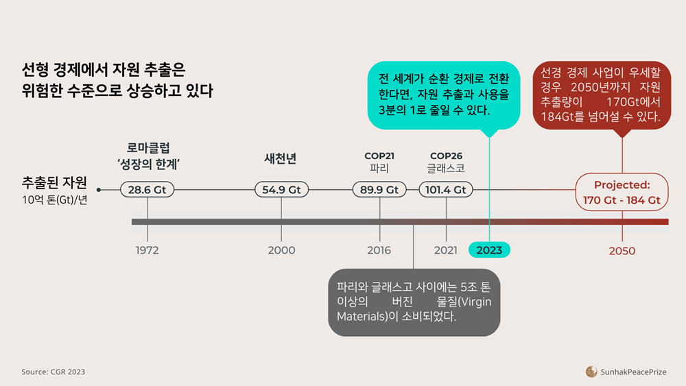 지난 수십 년간의 선형경제 체제에서 우리는 지구의 자원을 엄청나게 추출해 왔습니다. 자원 추출량은 꾸준히 증가하여 1972년 28.6기가 톤에서 2021년에는 101.4기가 톤이 되었습니다. 만약 지금과 같은 선형경제가 지속된다면 2050년 지구의 자원 추출은 170기가 톤을 상회할 것으로 전망됩니다.