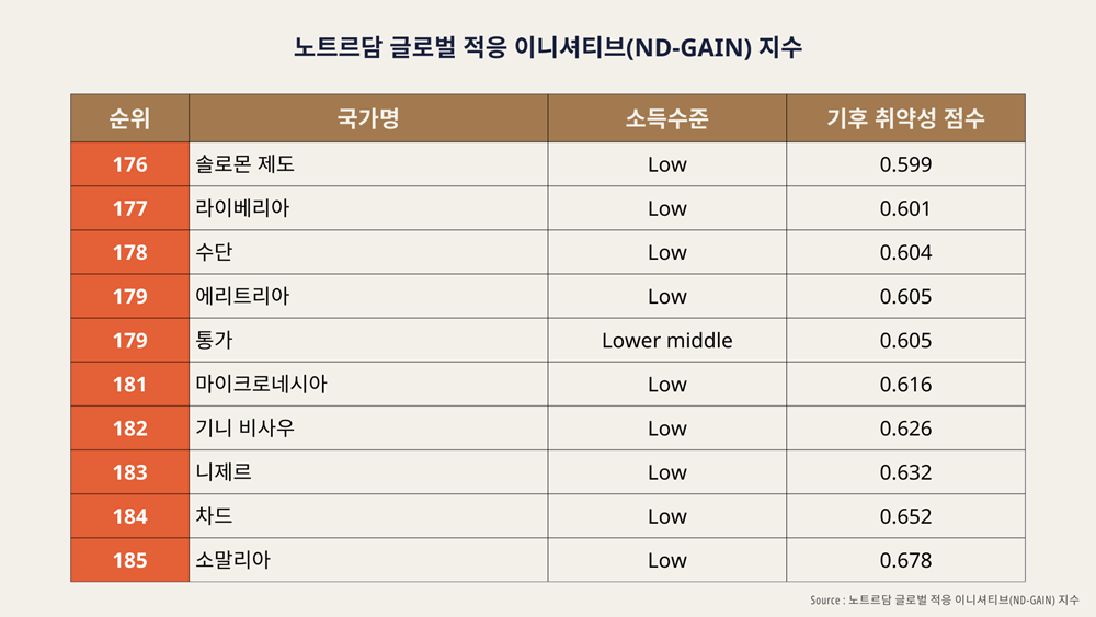 노트르담 글로벌 적응 이니셔티브(ND-GAIN) 지수는 기후 변화에 대한 각국의 취약성을 평가하여 순위를 제공하고 있어요.