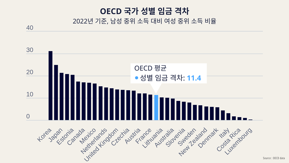 2022년 기준, 경제협력개발기구(OECD) 회원국들의 여성은 남성보다 약 12.1% 적은 임금을 받았어요(OECD Employment Outlook 2022).