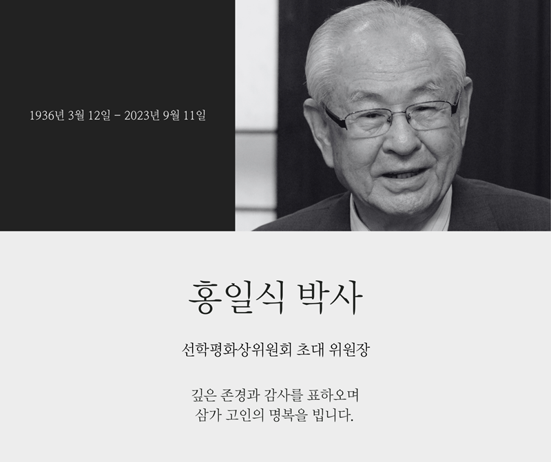 평화와 교육의 거목, 홍일식 선학평화상위원회 초대 위원장이 87세를 일기로 2023년 9월 11일 우리들의 곁을 떠났습니다.